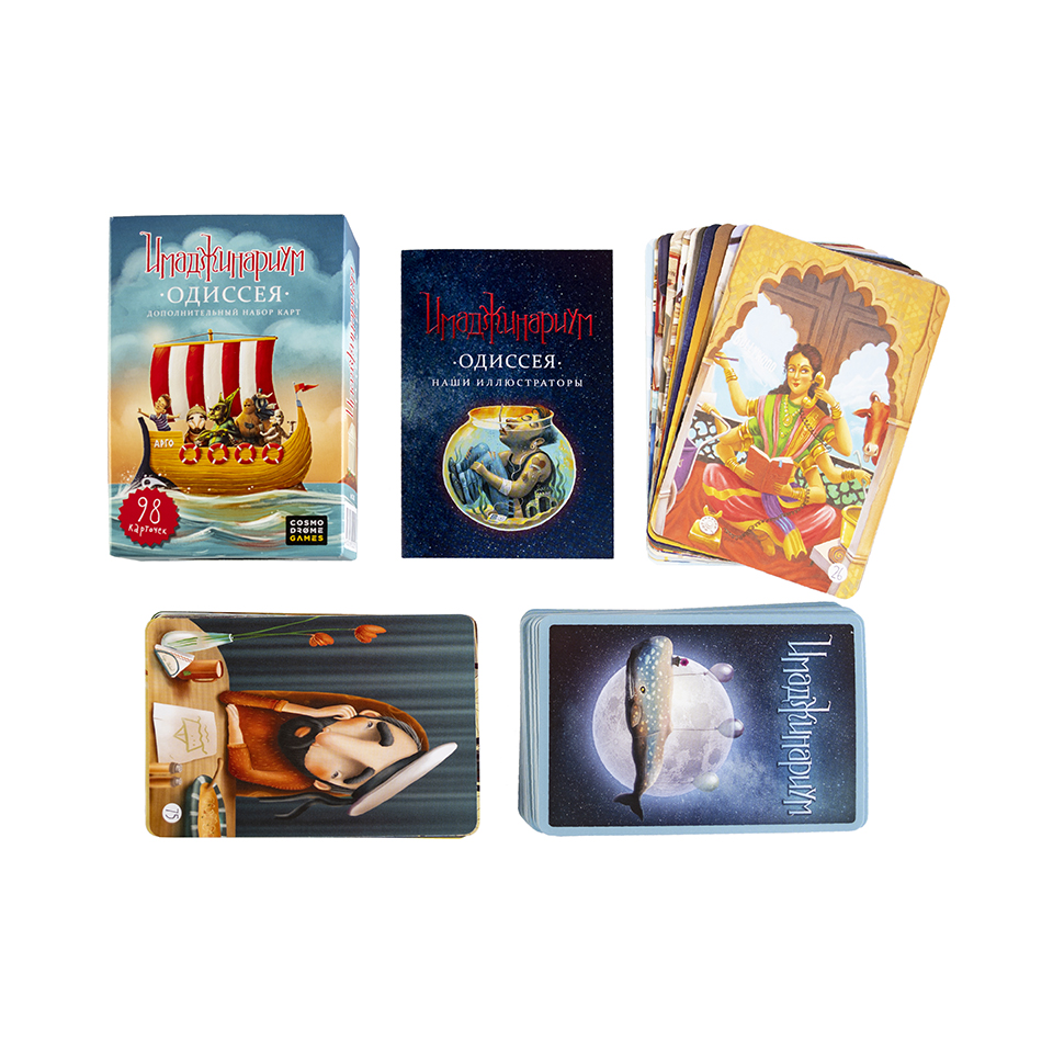 Это дополнение — 98 новых карт для «Имаджинариума». Поиграть в него без базового набора фишек и без игрового поля не получится — поэтому если вам приглянулись карты «Одиссеи», рекомендуем базовую версию игры «Имаджинариум» — в ней уже есть все необходимое для игры.